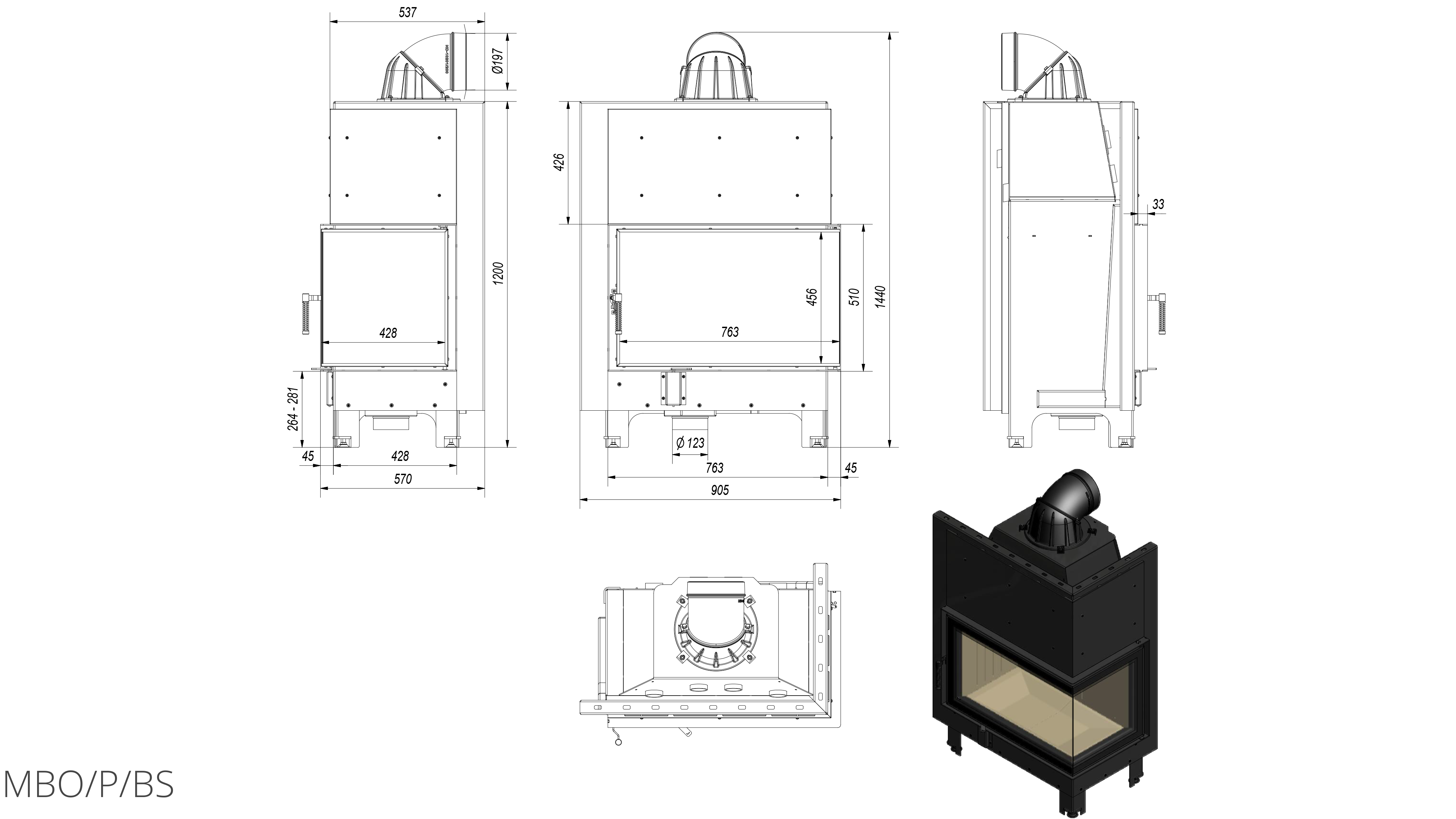Focar de otel cu grosimea peretelui de 4 mm, captusit cu samota, echipat cu geam ceramic refractar 800°C.