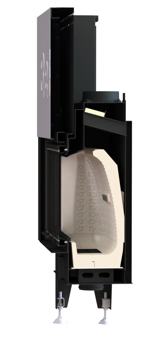- camera de combustie, care este conceputa in baza testelor aerodinamice. Aceasta asigura un flux perfect al gazelor de ardere. Suprafata structurata a carconului capteaza microparticulele si ajuta la arderea lor ulterioara. Vatra este construita din placi din material acumulator 100 % mai masiv. Datorita acestui fapt vatra ramane incalzita o perioada mai lunga, pana la 12 ore.