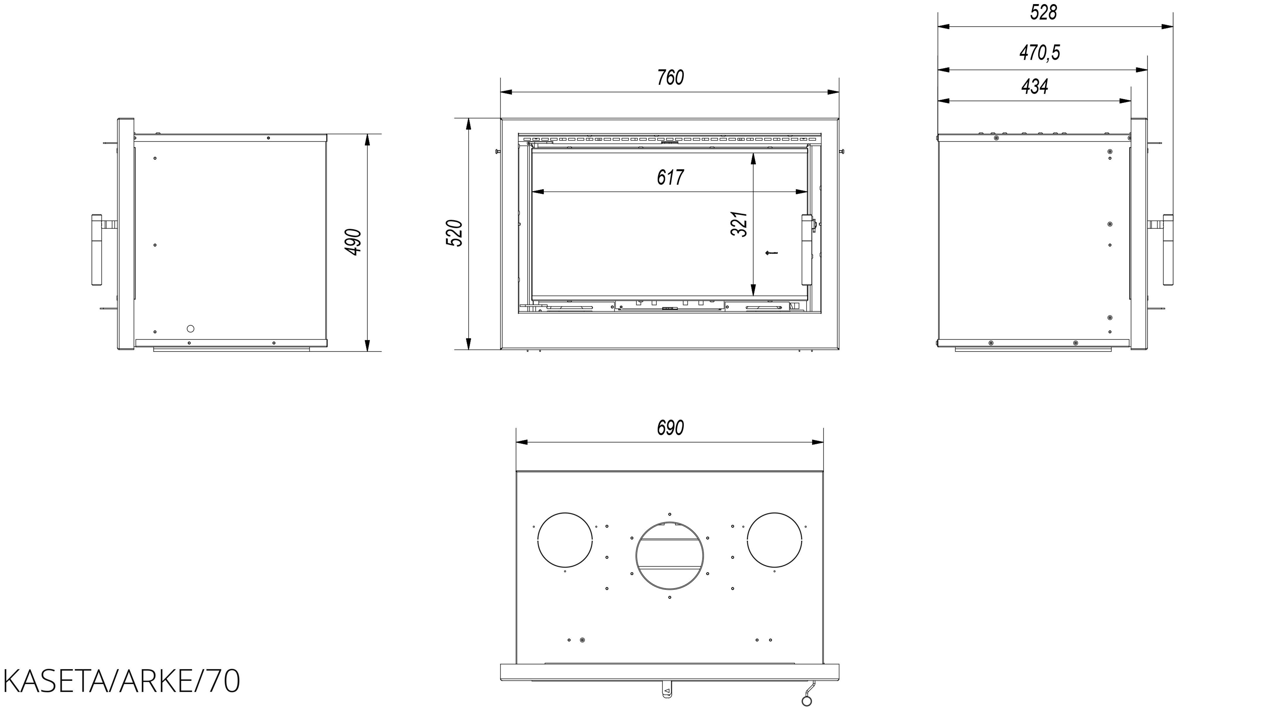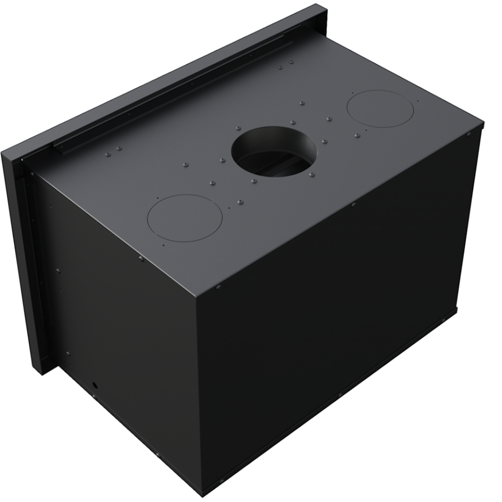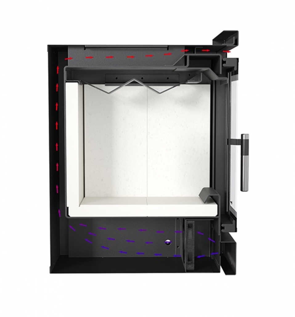 Focar de otel cu grosimea peretelui de 4 mm, captusit cu samota, echipat cu geam ceramic refractar 800°C si un ventilator incorporat ce permite distributia de aer cald si in alte incaperi separate fata de unde este amplasat semineul.