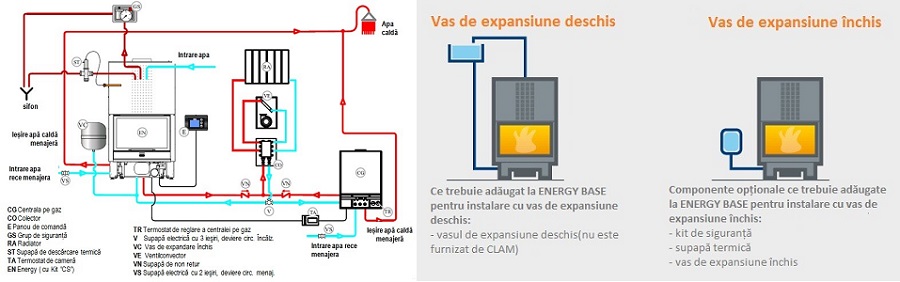 Admisie aer mediu ambiental, clapeta de tiraj, serpentina de racire - INCLUS si poate fi legat pe circuit propriu sau in paralel cu o alta sursa de incalzire ( centarala pe gaz, centrala electrica, panouri solare).