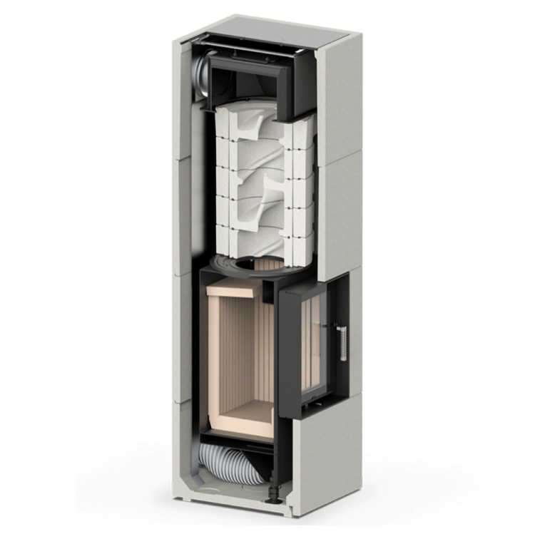 Semineu modular de forma rotunda cu inele de acumulare si imbracaminte din beton. Montaj rapid fara mizerie. Acumulare de caldura de pana la 12 ore.