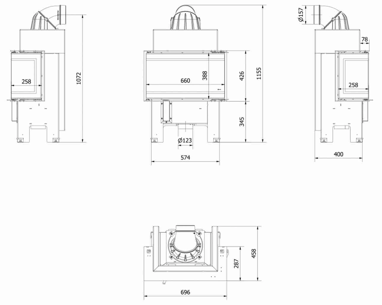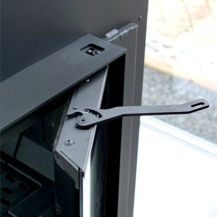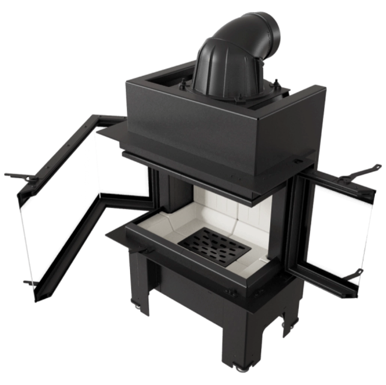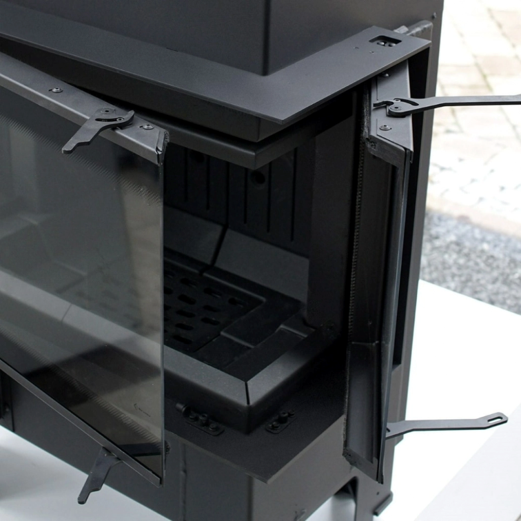 Focar elegant cu trei laturi de sticla si deschidere normala (pe orizontal) pentru seminee pe lemne moderne. Interior captusit cu samota si tehnologie de ardere a lemnului de ultima ora.