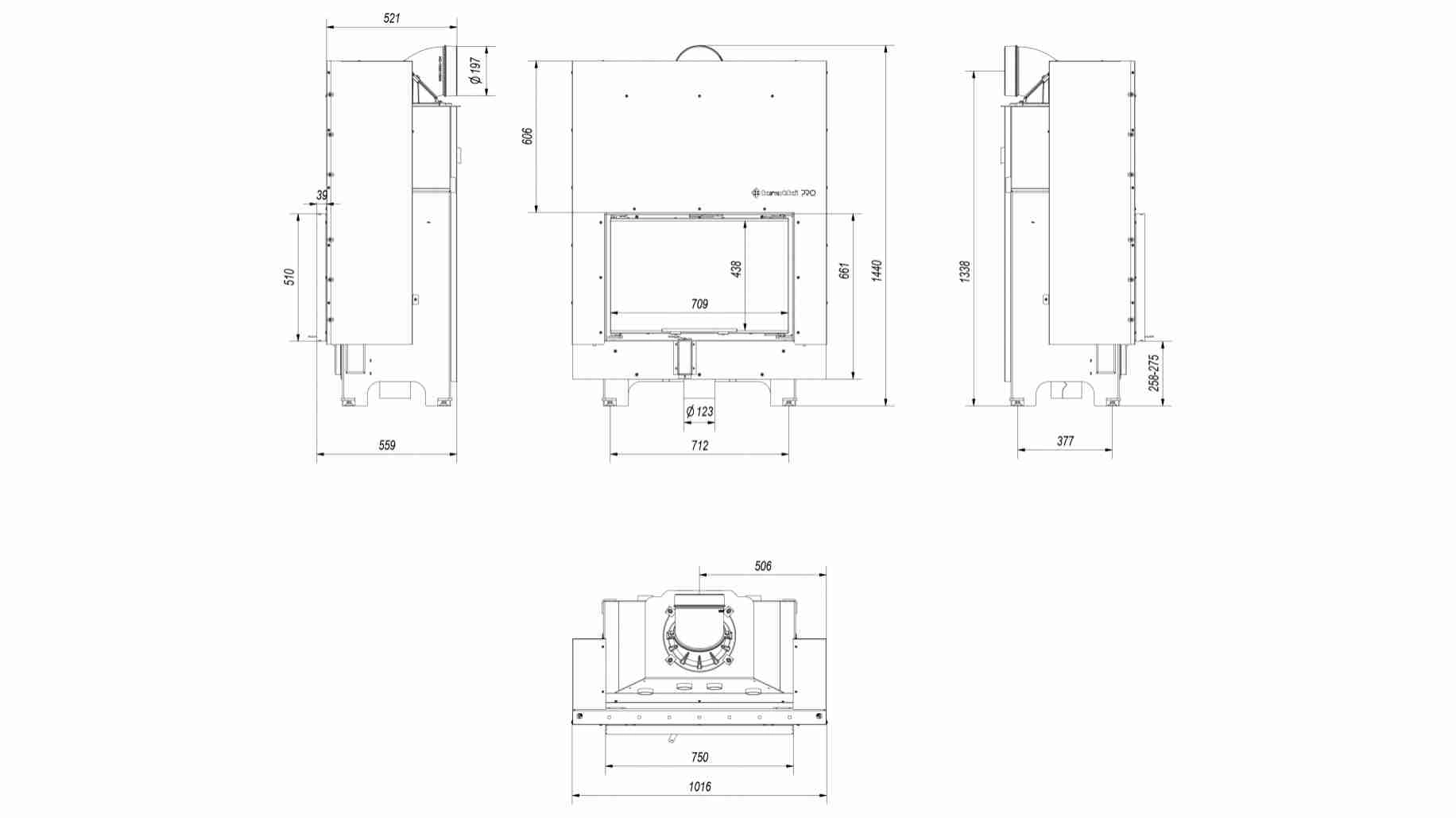Focarul este prevazut cu deschidere verticala, prin glisarea usii, oferind un plus de confort acestuia. Usa este prevazuta si cu deschidere standard, orizontala, pentru o curatare usoara a sticlei. Focarul este echipat la nivelul conului cu sistem de recuperare a caldurii, compus din tevi orizontale ce preiau din caldura gazelor de evacuare, crescand eficienta acestuia. Datorita samotei pro din interior si a arderii pe vatra, procesul de ardere al lemnului este mult mai amplu, rezulatand reziduri de cenusa reduse si un randament crescut. Focarul este echipat cu racord reglabil la 360 grade, pentru a facilita racordarea acestuia la cosul de fum.