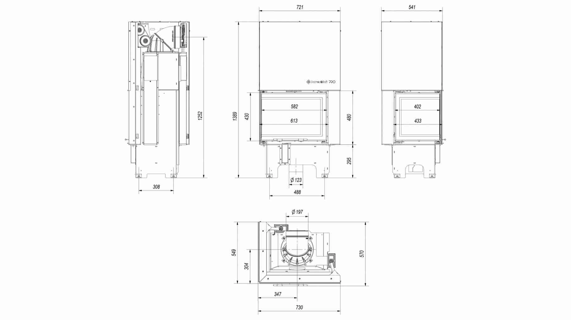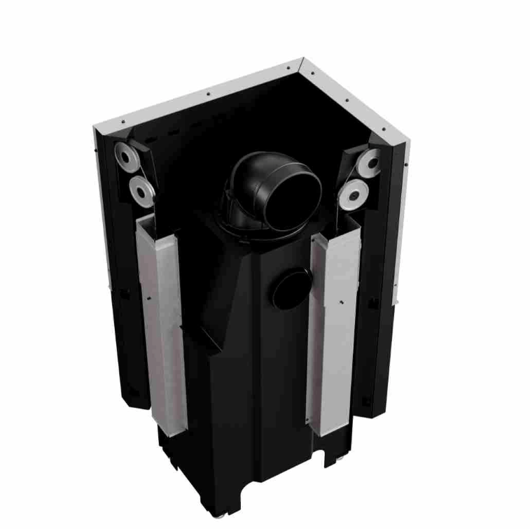 Focar cu sticla pe doua laturi, prevazut cu deschidere verticala, prin glisarea usii, oferind un plus de confort acestuia. Usa este prevazuta si cu deschidere standard, orizontala, pentru o curatare usoara a sticlei. Focarul este echipat la nivelul conului cu sistem de recuperare a caldurii, compus dintr-o teava orizontala ce preia din caldura gazelor de evacuare, crescand eficienta acestuia. Datorita samotei de la interior si a sistemului de tripla combustie, procesul de ardere al lemnului este mai eficient si mai economic. Focarul este dotat cu racord reglabil la 360 grade, pentru a facilita racordarea acestuia la cosul de fum.