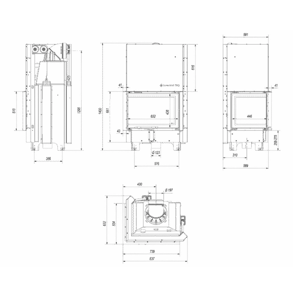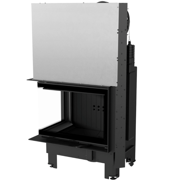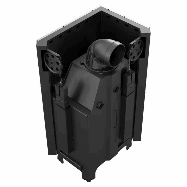 Focarul este prevazut cu deschidere verticala, prin glisarea usii, oferind un plus de confort acestuia. Usa este prevazuta si cu deschidere standard, orizontala, pentru o curatare usoara a sticlei. Focarul este echipat la nivelul conului cu sistem de recuperare a caldurii, compus din tevi orizontale ce preiau din caldura gazelor de evacuare, crescand eficienta acestuia. Datorita samotei din interior si a sistemului de ardere pe vatra, procesul de ardere al lemnului este mai complet, rezultand reziduri de cenusa reduse. Pe conul focarului este amplasata o evacuare reglabila la 360 grade, pentru o racordare facila a acestuia la cosul de fum.