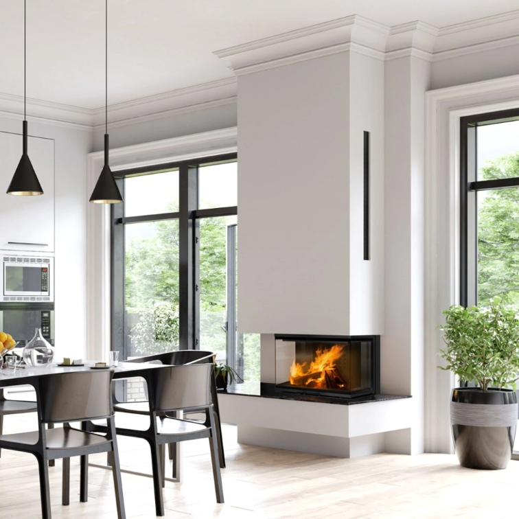 Focarul cu sticla pe trei laturi, cu deschidere verticala, prin glisarea usii, ce ofera un plus de confort acestuia si un design modern. Usa este prevazuta si cu deschidere standard, orizontala, pentru o curatare usoara a sticlei. Datorita samotei din interior si a sistemului de ardere pe vatra, procesul de ardere al lemnului este mai amplu, rezultand astfel reziduri de cenusa reduse. Focarul este dotat cu o evacuare reglabila la 360 grade, pentru o racordare facila la cosul de fum. ACesta este echipat la nivelul conului cu sistem de recuperare a caldurii, compus din tevi orizontale ce preiau din caldura gazelor de evacuare, crescand eficienta acestuia.